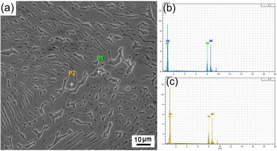 Based on the content of copper and zinc, α phase can be distinguished from the β phase. Figure 5 exhibits the microstructure of the H62 brass and the corresponding EDS pattern. It is shown that the H62 brass consists of bright and dark phases. Furthermore, the EDS pattern shows that the bright area at position 2 contains 63.53% copper, 36.47% zinc, which is α phase (as shown in Figure 5b), and the dark area at position 1 contains 54.55% copper, 45.45% zinc, which is β phase (as shown in Figure 5c).