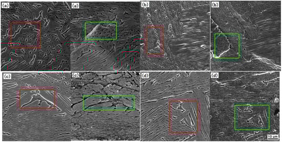 The microstructure before and after upsetting at different deformation temperatures (deformation rate: 0.1 s−1, deformation amount: 25%) is obtained in Figure 6. SEM microstructures in the same region before and after upsetting deformation are described in Figure 6a,a’ under room temperature (20 °C). The edge of α phase bulges and covers β’ phase after upsetting, which is attributed to the characteristics of the β’ phase. The ordered β’ phase transformed by the β phase has the characteristics of a high hardness and a low deformation ability at room temperature. The flow of α phase is higher than β’ phase, and β’ phase is covered by the α phase at this temperature. When the deformation temperature increases to 300 °C, although the α phase bulges, the severe covering phenomenon that α phase covers β’ phase is absent, which indicates that the flow of β’ phase increases relatively, as shown in Figure 6b,b’. As the deformation temperature increases to 400 °C, the phenomenon that the α phase covers β’ phase is not dominant. However, β’ phase could not inhibit the accumulation of α phase at this temperature. The flow of β’ phase is enhanced, but it is still lower than that of α phase at 400 °C, as shown in Figure 6c,c’.