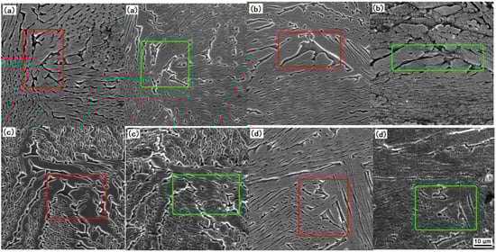 Effect of different deformation rates on flow under 400 °C and 500 °C: (a) 0.01, (a’) 0.01 after upsetting, 400 °C; (b) 0.1, (b’) 0.1 after upsetting, 400 °C; (c) 0.01, (c’) 0.01 after upsetting, 500 °C; (d) 0.1, (d’) 0.1 after upsetting, 500 °C (The red rectangles are the observation areas before deformation and the green rectangles are the observation areas after deformation).