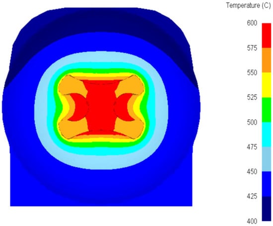 Due to the complex cross-sectional shape of the product, the deformation resistance during continuous extrusion is so large that the four corners of the H-shaped cannot be completely filled for H62 brass. Moreover, the great deformation resistance leads to an extremely high load on the die and the main motor of the equipment, thus the life of the die is shortened. According to the above analysis obtained by the hot compression tests, the flow and plasticity of H62 brass are significantly improved when it is deformed above 500 °C. The numerical simulation was carried out with different extrusion wheel speeds, and the continuous extrusion model was based on the TLJ250 equipment. Due to the uncertainty of environmental heat transfer and deformation heat during the experiment, the temperature distribution of the product along the cross-section obtained through numerical simulation is shown in Figure 9. It is shown that the temperature in the corner area reaches 550 °C, which is higher than the β phase transition temperature (456 °C), thus the H62 brass has a good flow.