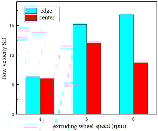 The hot compression tests show a negative correlation between the flow and the deformation rate of H62 brass. Different positions are chosen at the edge and center of the H-shaped product section, which is shown in Figure 10a,b, respectively. The standard deviation (SD) of the flow velocity at the edge and center at the extrusion wheel speeds of 4,6,8 rpm was calculated, respectively, to quantify the flow uniformity of H62 brass in the continuous extrusion process of H-shaped wire at different extrusion wheel speeds. The corresponding SD is shown in Figure 11. The lower extrusion wheel rotation speed leads to a smaller SD of the flow velocity on the product cross-section, indicating that the flow inside the product is more uniform with the decrease in the deformation rate. However, the production efficiency is too low for a lower extrusion wheel rotation speed (such as 2 rpm), and it is not conducive to real massive industrial production. Therefore, the chosen extruding wheel speed is 4 rpm, and the H62 billet and die were preheated to 500 °C for continuous extrusion experiments.