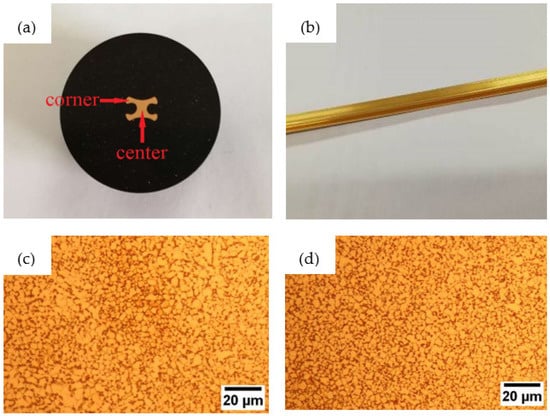 The continuous extrusion experiment was carried out with the optimal parameters obtained from the numerical simulation, and the product is shown in Figure 12. The complex edge was completely filled, the surface finish was fine, and there was no surface cracking, bubbles, or other defects. Figure 12a,b show the metallographic structure of the H-shaped wire product section’s center and corner area, respectively. The dark β phase is evenly distributed in the bright α phase; the grain size is 2~5 μm. The grain size of the center and corners has a good consistency, and the product’s internal structure is uniform, which positively affects the stability of product quality. These are attributed to the two-phase synergistic flow characteristic in H62 brass. Thus, the optimal process parameters of H62 brass in the continuous extrusion process are obtained; at the same time, it also provides guides for the other plastic processing of H62 brass. Figure 12c,d show the grains are refined after continuous extrusion for up-drawing continuous casting H62 brass based on optimal parameters obtained from the numerical simulation.