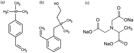 The IX resins used were Dowex 1X8, IRA-402 and IRA-410. Dowex 1X8 is a strong base anion (SBA) exchanger with quaternary ammonium as functional groups and 8% DVB (divinylbenzene) content. IRA-402 is similar; it consists of SBA resin with quaternary ammonium groups and a 6% DVB content. Dowex 1X8 and IRA-402 are both type I resins. Additionally, IRA-410 is a type II resin with dimethylethanolamine functional groups. The structures of the functional groups for both type I and type II resins are shown in Figure 1. In addition, the structure of MGDA (the complexing ligand used in this study) is shown on the same figure. The physical and chemical properties of the selected resins are shown in Table 2.
