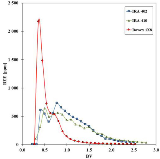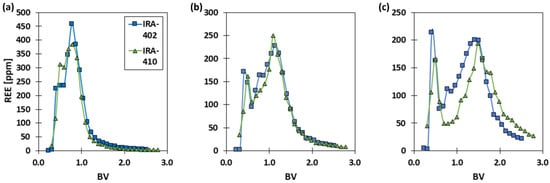 Figure 2 displays profiles obtained with the Dowex 1X8, IRA-410, and IRA-402 when the REE–MGDA mixture “Feed #2” (Table 3) was eluted through the packed bed with 10 mM HNO3. In all cases, the elution profile (total REE concentration) consists of two partially separated peaks. Their origin and composition are discussed later in the paper, but the Dowex 1X8 yields inferior separation of the REEs compared to the IRA resins. With the Dowex 1X8, the majority of the REEs are eluted within a large peak at the void volume of the column. The IRA-402 resin, in contrast, exhibits a broader elution profile in which the REEs are mostly retained by the resin. These two resins have the same functional group but differ in cross-linking density (8 wt-% for Dowex 1X8 vs. 6 wt-% for IRA-402). This suggests that 8 wt-% DVB content results in a polymer matrix too dense for the REE–MGDA complexes to penetrate the gel area and reach the functional groups. This is congruent with the findings in previous publications, which studied the separation of EDTA–Ln (Ln = Lanthanide) complexes with, for example, Dowex 1X2 and 1X4 resins [36,37]. In addition, IMDA–Ln complexes were investigated with different Dowex 1X and 2X resins; Dowex 2X8 has been shown to be a suitable resin for REE separation. Sodium trimetaphosphate gradient eluent was used to separate adjacent REEs [29]. In this study the IRA-410 was found to have similar properties to the Dowex 2X8.