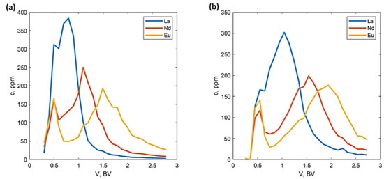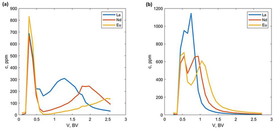 Effect of HCl concentration in the eluent on the retention behavior of REEs on IRA-410: (a) 10 mM HCl; (b) 50 mM HCl (flowrate = 2.98 BV/h; feed solution = #2; feed volume = 0.05 BV).