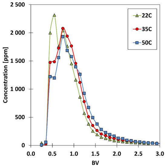 The temperature was found to have a small effect on the separation of the REE–MGDA complexes (Figure 5). Increasing the temperature enhanced the sorption of the MGDA–REE complexes. Higher temperatures caused the resin matrix to become more flexible and swollen, allowing for better mass transfer and enhancing the kinetics, which can be seen as a slightly faster process cycle. This caused a decrease in the size of the frontal peak group at the beginning of the chromatogram. The REE mass balance shifted to the right towards the second peak group, where we observe the retention of the MGDA-REE complexes. Temperature did not have noticeable effect on the desorption or retention. Higher temperatures than ambient (22 °C) could be used in the loading step of a two-step process to enhance the sorption of the MGDA–REE complex.