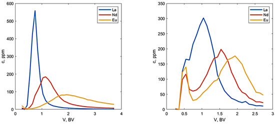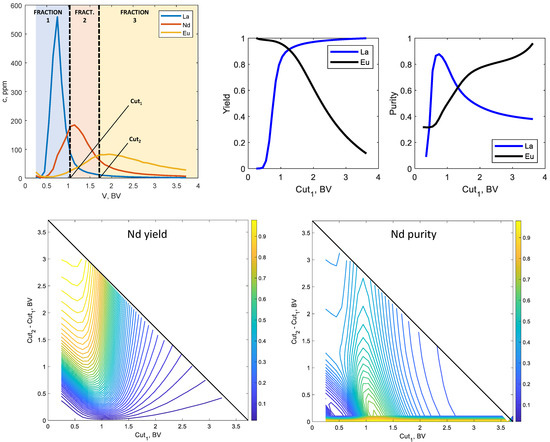Figure 12 shows that setting Cut1 = 0.84 BV results in 81% purity and 80% yield for La. Cutting a little later (Cut1 = 1.1 BV) increases the La yield to 89%, but the purity decreases to 70%. This is, nevertheless, a good result for a single process step in a ternary REE mixture, considering that the feed purity is approximately 33% for each metal.