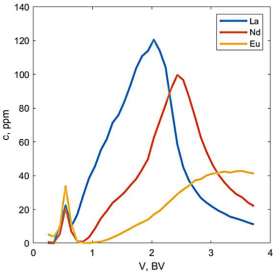 The differences between the complex stabilities were investigated with a simple titration method. For titration purposes, the REEs (La, Nd, Eu) were complexed with MGDA individually. Initial pHs of the samples were set to 10.5 (>pKa3 = 9.9) when the MGDA forms stable chelate with REE. These samples were then titrated with 0.1 M HCl. The equilibrium point is observed as a gentle slope in the pH/dV curve (Figure 9). The results verify our assumption of the protonation of at least one of the carboxylic acid groups. Values for the first pKa of the MGDA–REE complex can be determined from the equivalent points of the titration curve. The value for the MGDA–La complex is significantly higher than that of the MGDA–Nd and MGDA–Eu complexes. The complex strengths have an order of La < Nd < Eu, which is in line with the order of the metals in the periodic table; complex strength is inversely proportional to the size of the ion. A decrease in the ionic radius results in more stable complexes [42]. REEs are known for their lanthanide contraction, which results in an atypical size of the ion when the mass of the ion increases [2]. The differences in pKa values between REE–MGDA complexes result in differences in the free energy of adsorption. The La complex with the largest pKa value determined gives a ∆G° (Gibbs free energy of adsorption) of −21.51 kJ/mol. The values of ∆G° for Nd and Eu are −18.30 kJ/mol and −16.67 kJ/mol, respectively. A larger negative free energy of adsorption indicates stronger interaction with the resin. This can be seen in the ratios between La, Nd, and Eu in the front peak. The Eu, which has the weakest interaction with the resin, has a larger share in the front peak compared to the original feed.