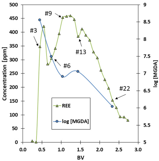 Chromatogram of the experiment as ∑REE with the corresponding logarithmic values of [MGDA]. (flowrate = 2.98 BV/h; feed (#2) = 0.05 BV, eluent = 50 mM HCl; T = 20 °C).