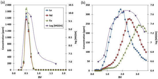 Chromatograms of the two-step process with separate loading and elution steps. In addition to [REE], the logarithmic [MGDA] is shown (T = 298 K ± 2 K; flowrate = 2.98 BV/h; feed (#2) = 0.1 BV; eluent = (a) deionized water, (b) 0.01 M HCl).