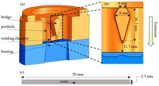 Figure 1a shows a section view of the porthole die configuration used in this study. The die that we used produced an extrudate with a rectangular cross section and included two major parts: the die mandrel (orange) and the die plate (blue). A series of different bridge geometries were digitally created to investigate the effect of the bridge geometry (upper and lower bridge angle) on the thermal mechanical history experienced by AA6082 during porthole die extrusion. The billet was first separated into two metal streams by the bridge, and then the two streams were rejoined to each other in the welding chamber to form a longitudinal seam along the mid-width location of the extrudate. Due to the friction caused by the die wall and the bridge, the exit velocity of the material at the profile’s edge compared to the middle width is relatively slower if the bearing length is uniform. Therefore, the bearing length was shorter at the edge and the middle width to balance the material’s exit velocity. The extrudate was a strip with dimensions of 2.5 × 50 mm (Figure 1c) with a weld seam at the mid-width location, the billet’s size was Φ106 × 200 mm and the extrusion ratio was 70.