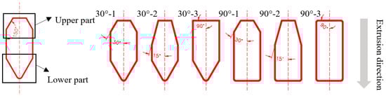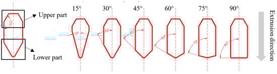 To quantitatively understand the effect of bridge geometry on the extrusion process, the lower bridge angle was varied from 15° to 90° in increments of 15°, as shown in Figure 2. Each die configuration is designated by its lower bridge angle, such as die 15°, die 30° etc.