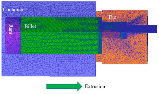 Due to the symmetry of the die configuration, only one quarter of the billet and porthole dies were included in the model to reduce the simulation time (refer to Figure 4). All the components were meshed using tetrahedral elements, including the ram, the container and the die. In order to increase simulation efficiency without sacrificing accuracy, different parts of the billet were meshed using elements of different sizes. Since the die bearing region experienced the most severe deformation, the billet material in the die bearing region was meshed using the smallest element (0.2 mm). The material in the billet, the portholes and the welding chamber were meshed using 5 mm, 1 mm and 0.5 mm sized elements, respectively.