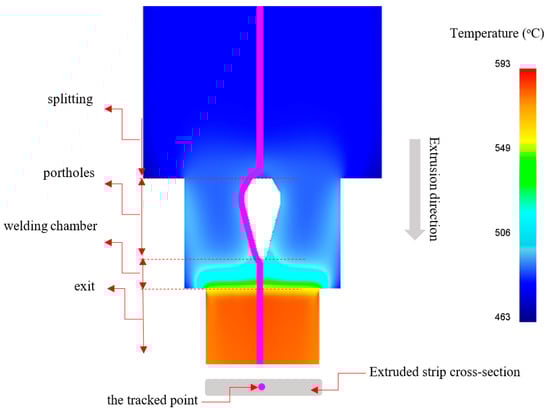 Flow path calculation is very important to analyze the material’s thermal mechanical history and predict the microstructure evolution during porthole die extrusion. In this research, the flow path was calculated based on the velocity field obtained from the ALE simulation. The algebra and verification of the flow path calculation was illustrated in detail in the author’s previous work [17]. Figure 5 shows the flow path (purple line) of a tracked point from a mid-thickness location along the weld line of the extruded strip during porthole die extrusion performed with a lower bridge angle of 15°. Since the tracked point was exactly on the weld seam at a mid-thickness location of the extruded strip, the thermal mechanical history of this point represents the thermal mechanical history of the seam. The tracked point experienced four stages during porthole die extrusion: splitting, porthole, welding chamber and exit [4]. During the splitting stage, the billet was divided into two metal streams by the bridge. In the porthole, the tracked point flowed on the surface of the bridge and accumulated a significant amount of strain under the friction shear stresses. These separated metal streams rejoined each other in the welding chamber and formed the weld seam in the middle of the profile. Finally, the material was squeezed out of the die to form the desired extrudate. In this paper, the state variables and thermal mechanical history in each stage were carefully examined in order to understand the effect of the bridge geometry on the porthole die extrusion.