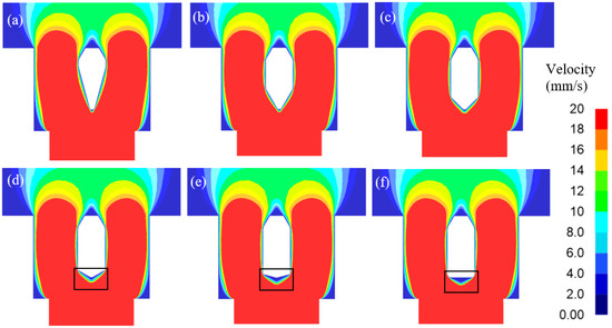Cross-sectional view of the model-predicted velocity distribution in the welding chamber for different lower bridge angles: (a) 15°, (b) 30°, (c) 45°, (d) 60°, (e) 75° and (f) 90°.