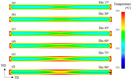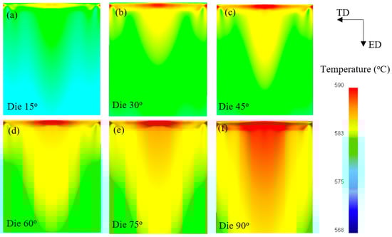 Cross-sectional view of the model-predicted extrudate’s exit temperature during porthole die extrusion for lower bridge angles of: (a) die 15°, (b) die 30°, (c) die 45°, (d) die 60°. (e) die 75° and (f) die 90°.