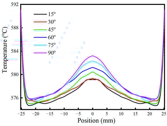 Figure 8 showed the model-predicted temperature distribution through the cross-section of the extruded profile at the die exit. Since the welding region (the middle of the extrudate) experienced the most severe deformation, it always had a relatively higher temperature than the material around it. Moreover, the temperature of the welding region also increased as the lower bridge angle increased. For instance, the die with a 90° angle had the highest temperature (583 °C) at the weld region, while the weld seam temperature produced using the die with a 15° angle was lowest (579 °C). The profile’s surface temperature showed the same trend, and it also increased with the lower bridge angle (Figure 9). To quantitatively show the temperature differences between different lower bridge angles, the model-predicted temperature distribution across the extrudate at a mid-thickness location (the black line shown in Figure 8) was plotted in Figure 10. As shown in Figure 11, the weld seam’s temperature was about 4.5 °C higher for the extrusion performed with a lower bridge angle of 90° when compared to an extrusion performed for a lower bridge angle of 15°. Though 4.5 °C did not seem to be a significant temperature difference, the experimental result showed that the die with a 90° lower bridge angle produced an extruded profile with a very rough surface close to the weld seam [31]. The weld seam temperature for the bridges with the smaller lower bridge angles could be because of the smoother material flow and absence of the dead metal zone. The impact of the smaller lower bridge angles on the temperature diminished as we move away from the weld seam. As shown in Figure 11, the model-predicted exit temperature of a region 12 mm away from the weld seam was only 1.4 °C higher when extruded using a die with a lower bridge angle of 90° when compared to a die with a lower bridge angle of 15°.