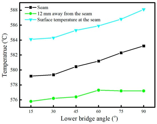 - As the lower bridge angle increased from 15° to 90°, the temperature of the welding seam increased from 579 °C to 583 °C and the strain increased from 40 to 117. The strain distribution plot implies that the microstructure and texture of the weld seam and its adjacent areas can be influenced by the geometry of the lower part of the bridge, but the rest of the material was almost unaffected.