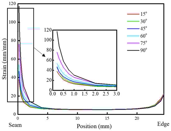 Model-predicted strain distribution showing the effect of lower bridge angle on the strain along the seam to the edge of the extrudate at the mid-thickness location (the red line in Figure 12f).