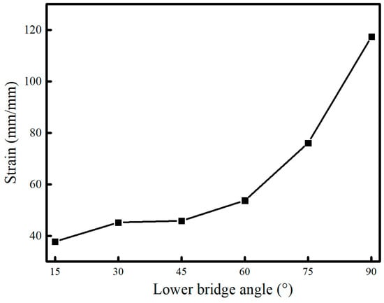 Model-predicted effect of lower bridge angle on the strain at the mid-thickness of weld seam after extrusion.