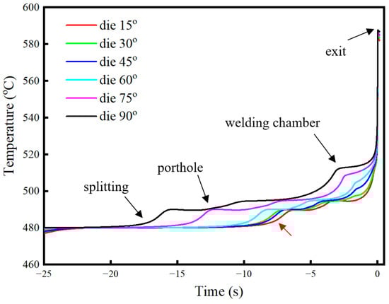 Figure 15 shows the model-predicted thermal history of the weld seam material using different lower bridge angles during extrusion. As mentioned earlier, the porthole die extrusion can be roughly divided into four stages: splitting, porthole, welding chamber and exit. Examining the thermal history of the weld seam material (the tracked point shown in Figure 5) during extrusion using a lower bridge angle of 90°, the temperature began to rise from the billet temperature of 480 °C when the splitting occurs at around 17 s (noted by the splitting arrow in Figure 15). After the material (see Figure 5) entered the portholes at around 12.5 s, its temperature increased because of the strong friction shear stress from the bridge surface; however, it also lost some heat due to its contact with the cold bridge. As a result, the temperature increased slowly during this stage. In the welding chamber, the temperature saw the largest increase, from 510 to 590 °C, due to the severe plastic deformation it experienced. Weld seam material extruded using lower bridge angles experienced very similar thermal histories, but each stage happened at different times due to their different velocities. For instance, the splitting stage of material extruded using a lower bridge die 15° occurred at 7 s (noted by a red arrow in Figure 15), and the temperature also began to rise at the same time.