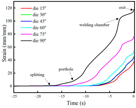 Model-predicted strain history at the mid-thickness of the weld seam for different lower bridge angles in the extrusion process.