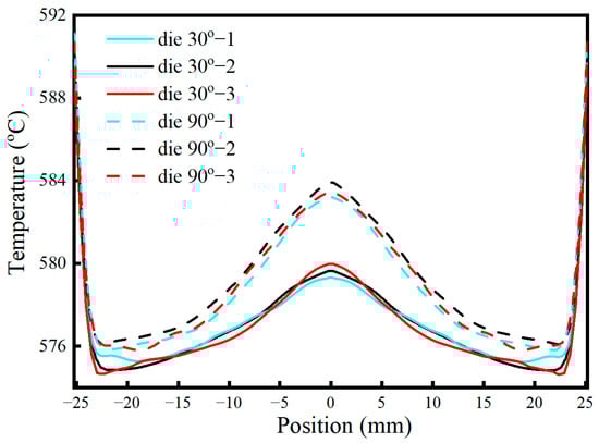 Figure 17 shows the model-predicted temperature distribution at the die exit when the geometry of the upper bridge was varied for dies with a lower bridge angle of 30° and 90° during extrusion. A change in geometry of the upper bridge did not have a significant effect on the temperature distribution. As shown in Figure 18, the temperature difference between die 90°−1 and die 90°−2 was only about 0.7 °C along the weld line. On the other hand, the temperature difference between die 30°−1 and die 90°−1 was about 4.5 °C along the weld line. It is very clear that the exit temperature is much more sensitive to the geometry of the lower bridge but not the geometry of the upper bridge.