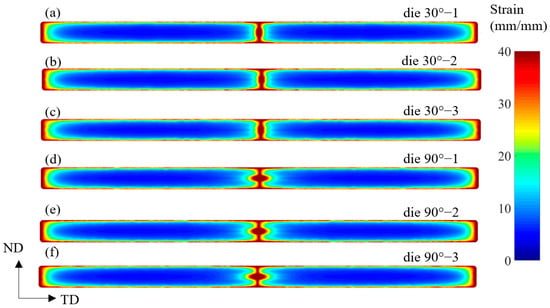 Strain distribution at the die exit of the profiles extruded using bridges with different upper bridge’s geometries. (a) die 30°−1, (b) die 30°−2, (c) die 30°−3, (d) die 90°−1. (e) die 90°−2 and (f) die 90°−3.