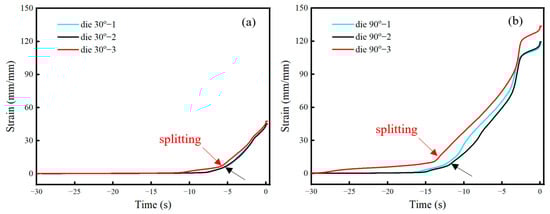 Model predicted strain history of the weld seam material and how it is impacted by the upper bridge’s geometry: (a) die 30° series and (b) die 90° series.
