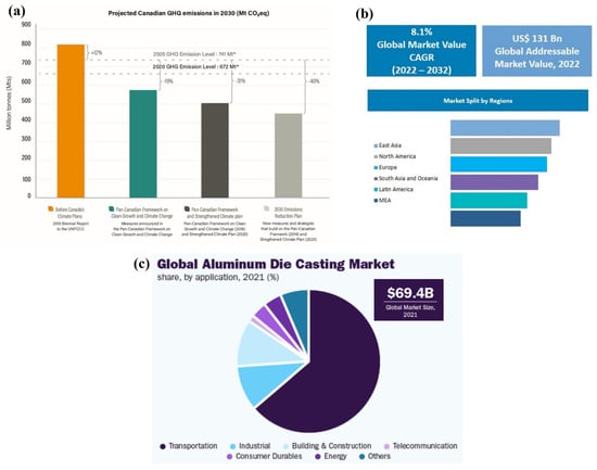 (a) Projected Canadian GHG emissions in 2030 in terms of CO2 equivalent [3]. (b) Global Al alloy market value split by regions from 2022−2032 [11]. (c) Global Al die−casting market share by application [9]. Reproduced with permission from open-access websites.