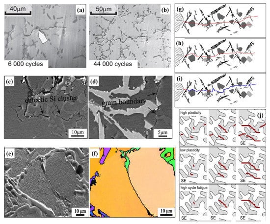 - Stolarz, J.; Madelaine-Dupuich, O.; Magnin, T. Microstructural Factors of Low Cycle Fatigue Damage in Two Phase Al–Si Alloys. Mater. Sci. Eng. A 2001, 299, 275–286. [Google Scholar] [CrossRef]
