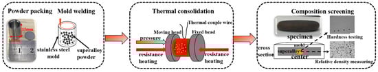 The alloy powder was packed into a graphite mold with a height of 70 mm and a diameter of 30 mm, and the powder was vibrated during the packing process. Subsequently, the mold full of powder was placed into the FHP-828 fast hot pressed sintering furnace and pre-pressed with a force of 40 MPa to compact the powder. Then fast hot pressed sintering was carried out below 10−1 Pa with a sintering temperature of 1150 °C and a holding time of 10 min, and the sintering pressure is 50 MPa.