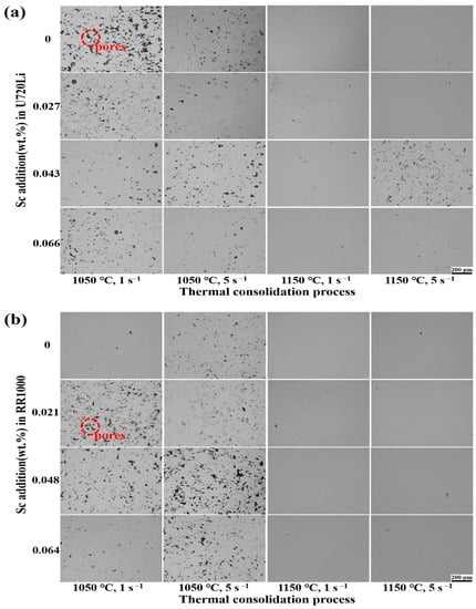 Metallograph of superalloys with different scandium addition under different thermal consolidation processes: (a) U720Li, (b) RR1000.