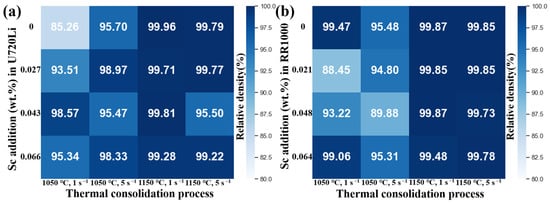 Relative density of superalloys with different scandium addition under different thermal consolidation processes: (a) U720Li, (b) RR1000.