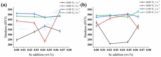 Hardness of superalloys with different scandium addition under different thermal consolidation processes: (a) U720Li, (b) RR1000.