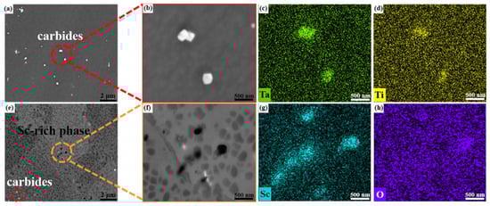 Figure 5 shows the SEM image of Sc-doped RR1000 superalloy with relevant EDS analysis. It can be seen that there is a kind of white precipitate distributed in two RR1000 and an additional black phase in the RR1000-0.064. Then EDS surface scanning was carried out on the white precipitate and the black phase. The results illustrate that the white precipitate seems to be a kind of carbide combined with tantalum and titanium, while the black phase seems to be a kind of Sc-rich phase combined with oxygen. The carbide has a size of ~250 nm while the Sc-rich phase has a smaller size of ~200 nm. Similar results have been demonstrated by Deng et al. [10], in which definite peaks of scandium and oxygen are captured in the black phase through TEM and EDS analysis, indicating that scandium has the ability to react with oxygen in the Ni-based superalloy. In addition, due to the difference in the chemical composition, in which U720Li has no tantalum addition, the white carbides can hardly be observed.