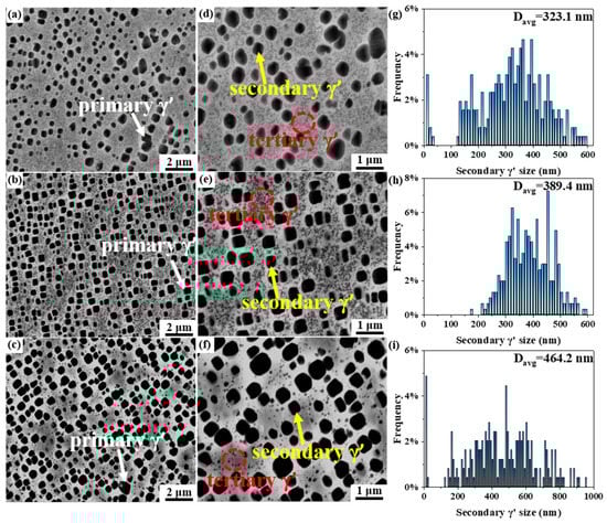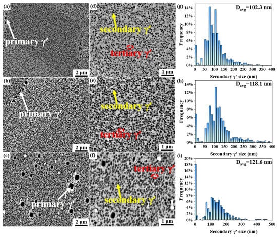 Morphology and distribution of γ’ in RR1000 with different scandium addition. (a,d,g) 0 wt.% Sc, (b,e,h) 0.048 wt.% Sc, (c,f,i) 0.064 wt.% Sc.