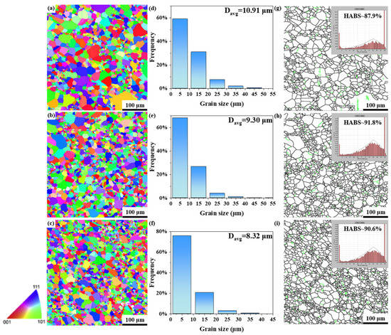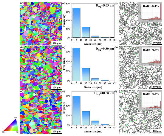 Inverse pole figure and Frequency histogram of grain together with distribution of grain boundary misorientation in heat-treated Sc-doped U720Li: (a,d,g) 0 wt.% Sc, (b,e,h) 0.043 wt.% Sc, (c,f,i) 0.066 wt.% Sc. Green lines represent the low angle boundaries (LABs) (0–15°) but the high angle boundaries (HABs) (>15°) were indicated by black lines.