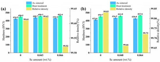 As shown in Figure 14, specimens prepared by fast hot pressed sintering achieve a high relative density of 99% in general, which was measured through Archimedes principle. And the hardness of as sintered Sc-doped superalloy both increase first and then slightly decrease with the increasing scandium content. Compared with as sintered condition, there is significant improvement in the hardness after heat treatment. Moreover, the hardness reaches the peak of 462 HV3 and 467 HV3 in U720Li and RR1000 when adding 0.06 wt.% scandium, which could be attributable to the impact of grain refinement.