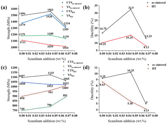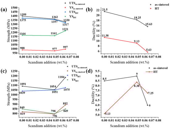Tensile properties of Sc-doped U720Li at 25 °C and 750 °C under different conditions are displayed in Figure 15. For room temperature tensile properties, it can be clearly seen that the ultimate tensile strength (UTS) of both as-sintered and heat-treated U720Li with 0.043wt.% scandium reach a peak of 1561 MPa and 1520 MPa, respectively. Accordingly, the ductility of U720Li-0.043 under two conditions also reach the highest level of 32.5% and 15.25%, which represent the elongation to fracture. Besides, heat treatment is found to have an optimistic impact on the enhancement of yield strength (YS) of U720Li, and the YS of heat-treated U720Li-0.043 and U720Li-0.066 increases by 14.4% and 12.1% respectively compared with the as-sintered specimens.