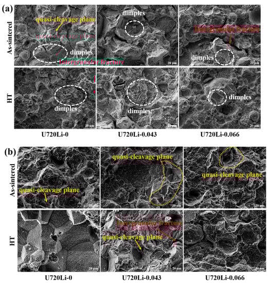 Fracture surface morphology of Sc-doped U720Li under different conditions: (a) 25 °C, (b) 750 °C.