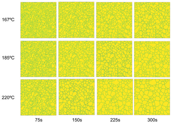 Simulated grain structures of zone-refined tin after 75, 150, 225, and 300 s (columns 1–4) during the isothermal process at a temperature of 167 °C, 185 °C, and 220 °C.