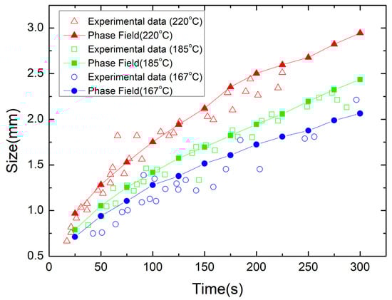 The simulated grain structures of zone-refined tin in an isothermal process at temperatures of 167, 185, and 220 °C are shown in Figure 1. Columns 1–4 in Figure 1 represent the simulated grain structures at 75, 150, 225, and 300 s. The calculation domain was detegrated into 512 × 512 grids, and the grid spacing was set to be 40 μm. Many millimeter-scale grains were obtained, and a significant grain growth process was observed during the isothermal process. Based on these simulation results, the computed average grain size is in good agreement with the experimental data by Holmes et al. [], as shown in Figure 2. It should be noted that in [], a time correction was used by the authors because the experimental time is not the true time necessary for a specimen to reach its measured grain size, and the experimental data in the form of log values were converted to normal values. In the beginning, the grain size increases rapidly, and then the growth speed decreases and the grain structure approaches a stable state. Note that the rate of grain boundary migration is inversely proportional to the average grain size. At higher temperatures, the rate of grain boundary migration increases, resulting in faster grain growth.