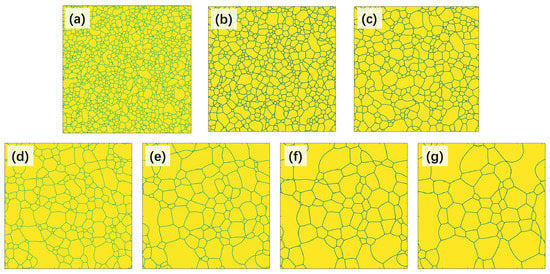 The alloy was continuously heated from 1050 °C to 1200 °C at a rate of 25 °C/s; here, we chose 1 s as a time interval and converted it into simulation steps with Equation (12). Note the number of simulation steps at different temperatures is not the same. The output simulated grain structure at the former temperature is the input grain structure in the calculation at the next temperature. Figure 3a–g shows the simulated grain structures at 1050, 1075, 1100, 1125, 1150, 1175, and 1200 °C in the heating process, respectively.
