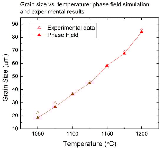 The calculated values of grain size as a function of time are plotted in Figure 4. We found that the simulation results and experimental measurements are comparable. It should be noted that the average grain size at 1050 °C is smaller than experimental data, which can be attributed to small random values used as the initial input for the phase field simulation. It is important to note that in the initial period of the simulation, the initial input grain structure is important and cannot be neglected.