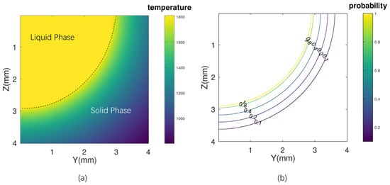 Computed values of (a) spatial distribution of temperature and (b) site selection probability in the cross-sectional plane of the weld of low-carbon steel.