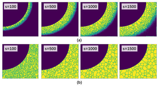 The evolutions of the textures of grains in the HAZ of low-carbon steel and Fe–6.5 wt.% Si alloy are illustrated in Figure 6a,b. Columns 1–4 in Figure 6 represent the simulated grain structures at 100, 500, 1000, and 1500 simulation steps, respectively. For low-carbon steel, the closer the site is to the fusion zone, the higher the temperature is, leading to a higher rate of grain boundary migration, and a coarser grain size was obtained in the final grain structure. In the solid region, the grain size increases with time and is inversely proportional to the distance from the heat source. For Fe–Si alloy, the grain growth rate is larger than that in low-carbon steel. This is because the grain boundary migration is related to the thermal activation process, and in the simulation, the value of activation energy of Fe–Si alloy is much higher than that of low-carbon steel [].