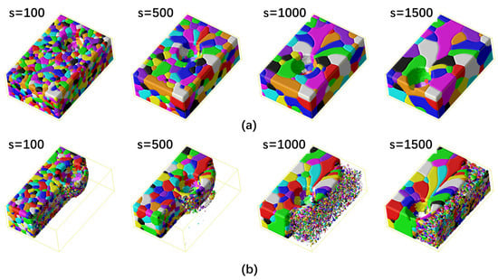 Temporal evolution of the grain structures during the welding of (a) two Fe–6.5 wt.% Si alloys and (b) Fe–6.5 wt.% Si alloy and low-carbon steel after different simulation steps. The different colors in the simulated grain structure represent the different orientations of the grains.