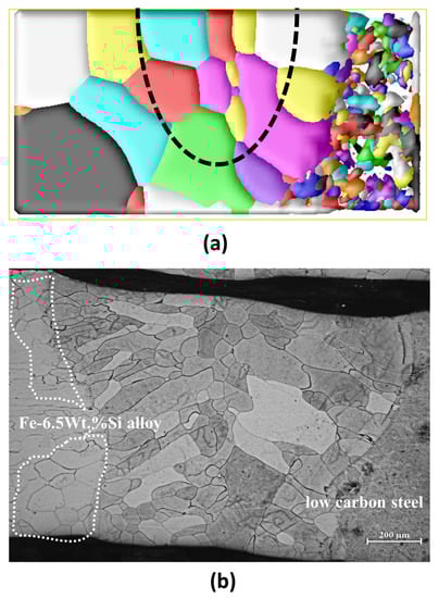 To verify the validity of numerical simulation results of the grain structures in the fusion zone and the HAZ during the welding process, experimental grain pictures and phase field results along the cross-sectional plane are illustrated in Figure 8. The details of the experimental setup can be found in Appendix A. The black dashed line in the simulation is the fusion line separating the fusion zone and the HAZ. Figure 8a shows the final grain structure during the welding process of joining low-carbon steel to Fe–Si alloy. The grains in the HAZ close to the fusion line grow into elongated columnar shapes. In contrast, grains that form farther away from the fusion line are usually small and equiaxed in the low-carbon steel site. It could be observed that the average grain size in the fusion zone is significantly smaller than that in the HAZ of Fe–Si alloy. This is because the kinetic undercooling during solidification makes grains in the melted fusion zone grow into equiaxed grains. There is good consistency between the experimental results and simulated grain structures.