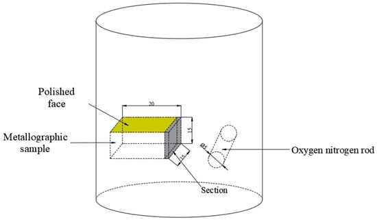 During the experiment, steel samples were taken during the RH refining process and from the tundish. The specific sampling plan is shown in Table 3. Metallographic specimens (20 mm × 15 mm × 15 mm) were taken from the edges of the steel samples after removing the oxide scales on their surfaces, as shown in Figure 1. After grinding and polishing, the morphology, quantity, size and composition of inclusions with sizes >1 μm in the steel were analyzed by automated SEM/EDS inclusion analysis (ASPEX, FEI, USA), scanning electron microscopy (SEM, JSM-6490LV, JEOL Ltd., Japan), and energy dispersive spectroscopy (EDS, Oxford Instruments, High Wycombe, UK). The contents of total oxygen (T.O.) and nitrogen in the steel were detected by inert gas fusion pulse-infrared absorption spectroscopy.